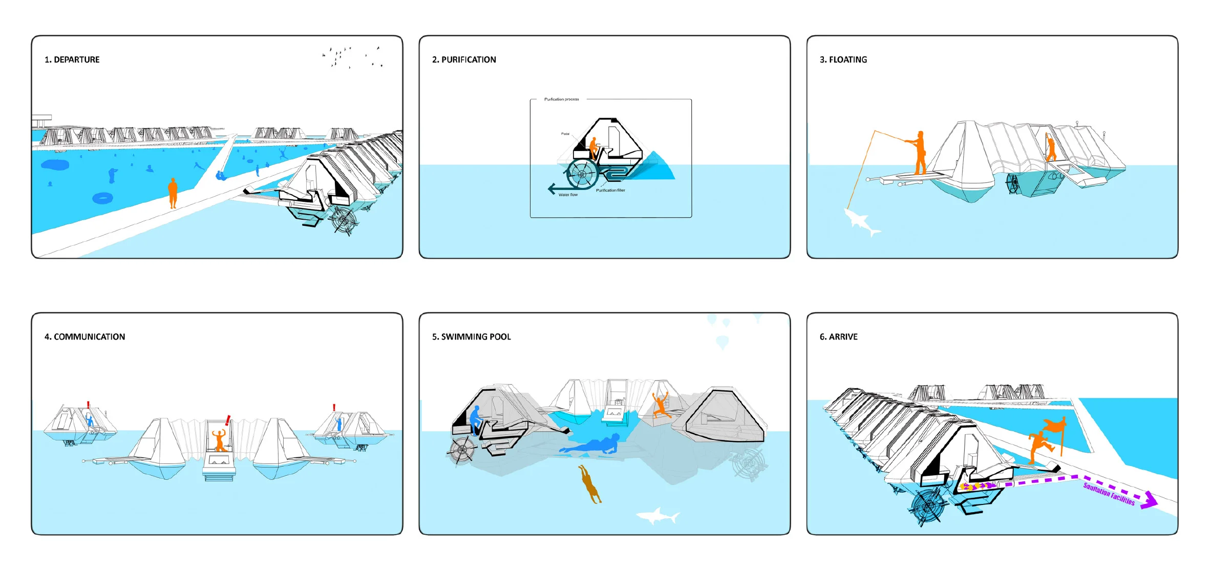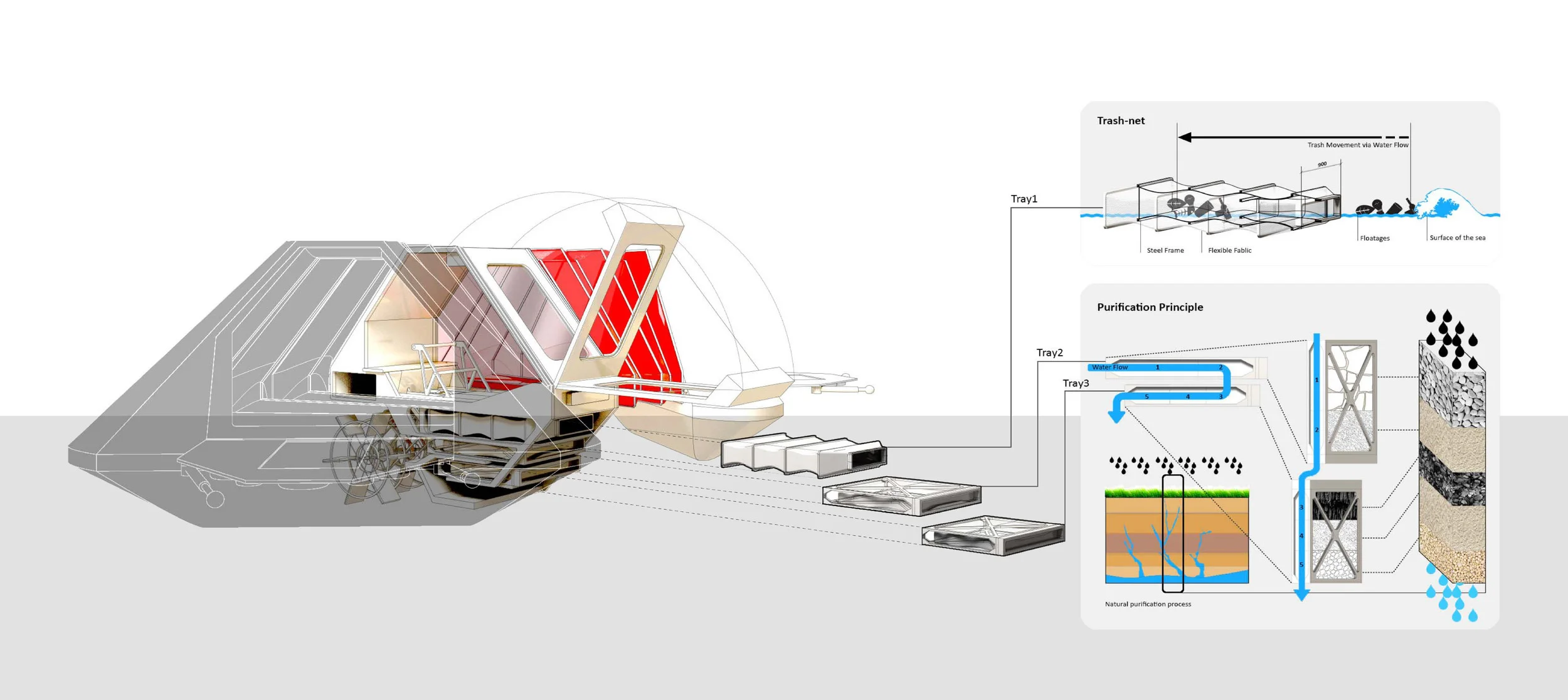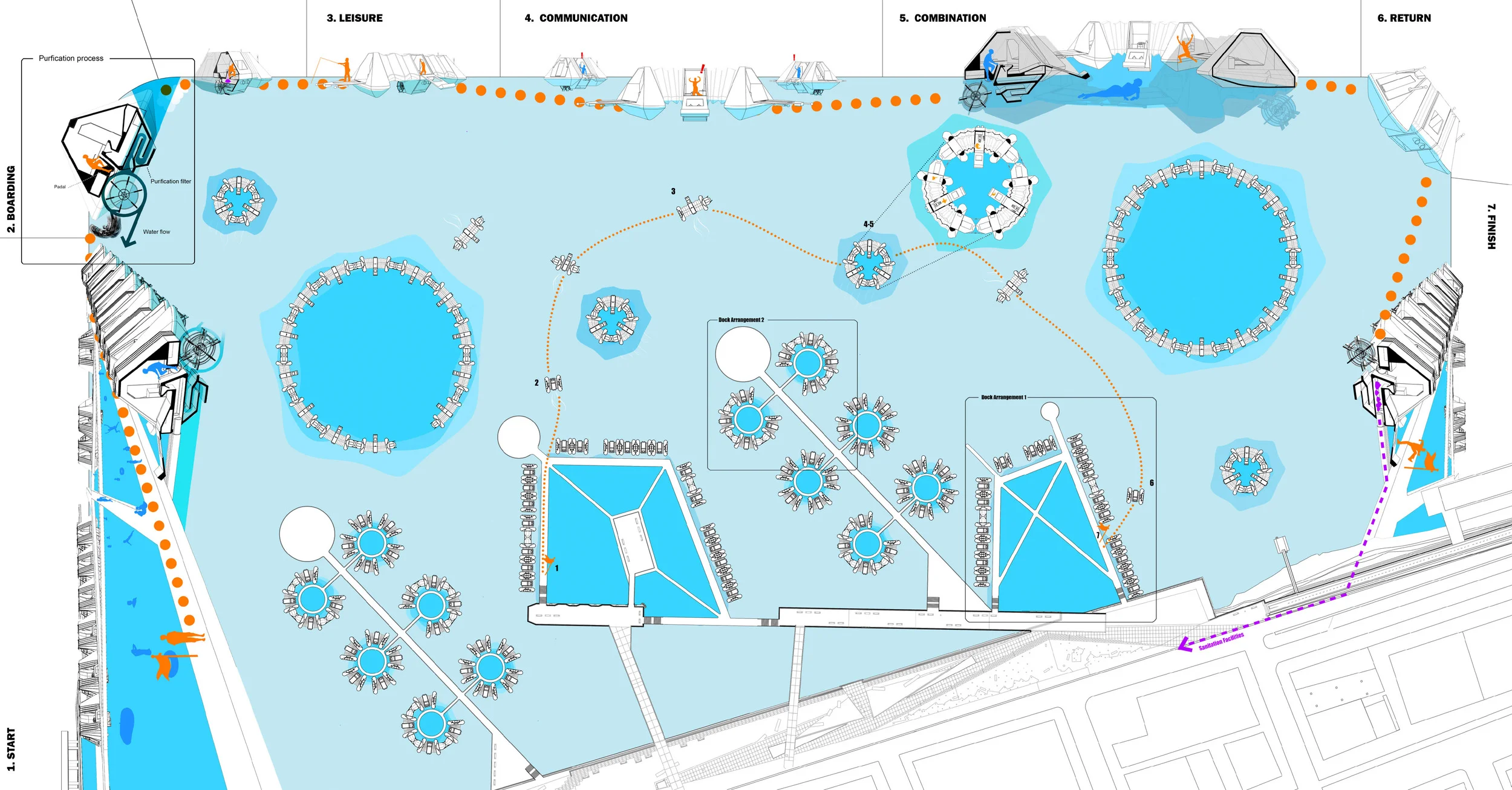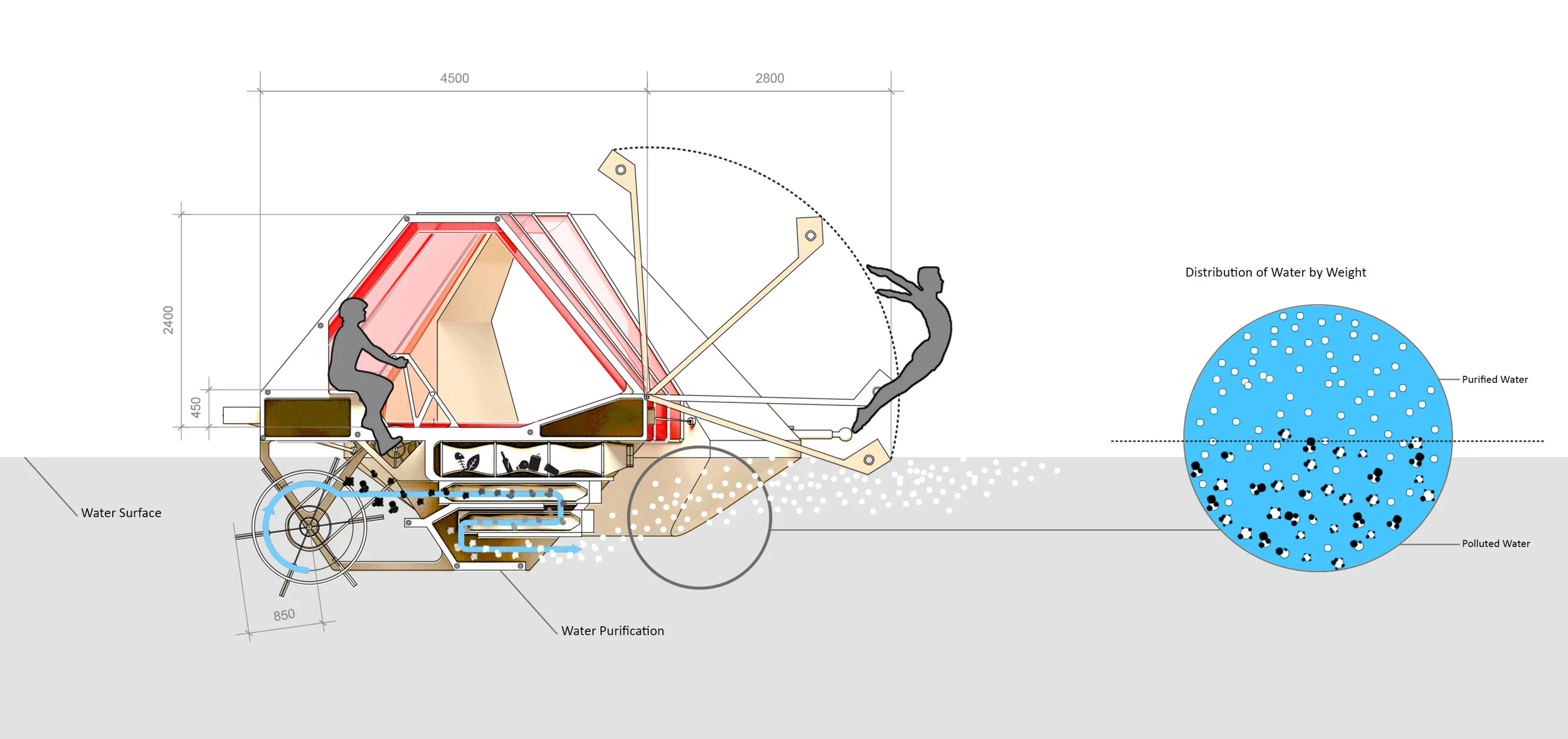 The floating toy is activating with entertaining. While they are enjoying their floating journey, at the same time, they are cleaning and purifying water unconsciously. When the machine is pedaled, water passes through the filter and is purified. In the floating toy, thee packings of filter, which are replaceable, are embedded in the machine. Each of the filter is activated padeling the machine. The first tray of filter collects garbages on the surface of water. And rest of filter purify water under the surface.The process of purification imitates the nature process.