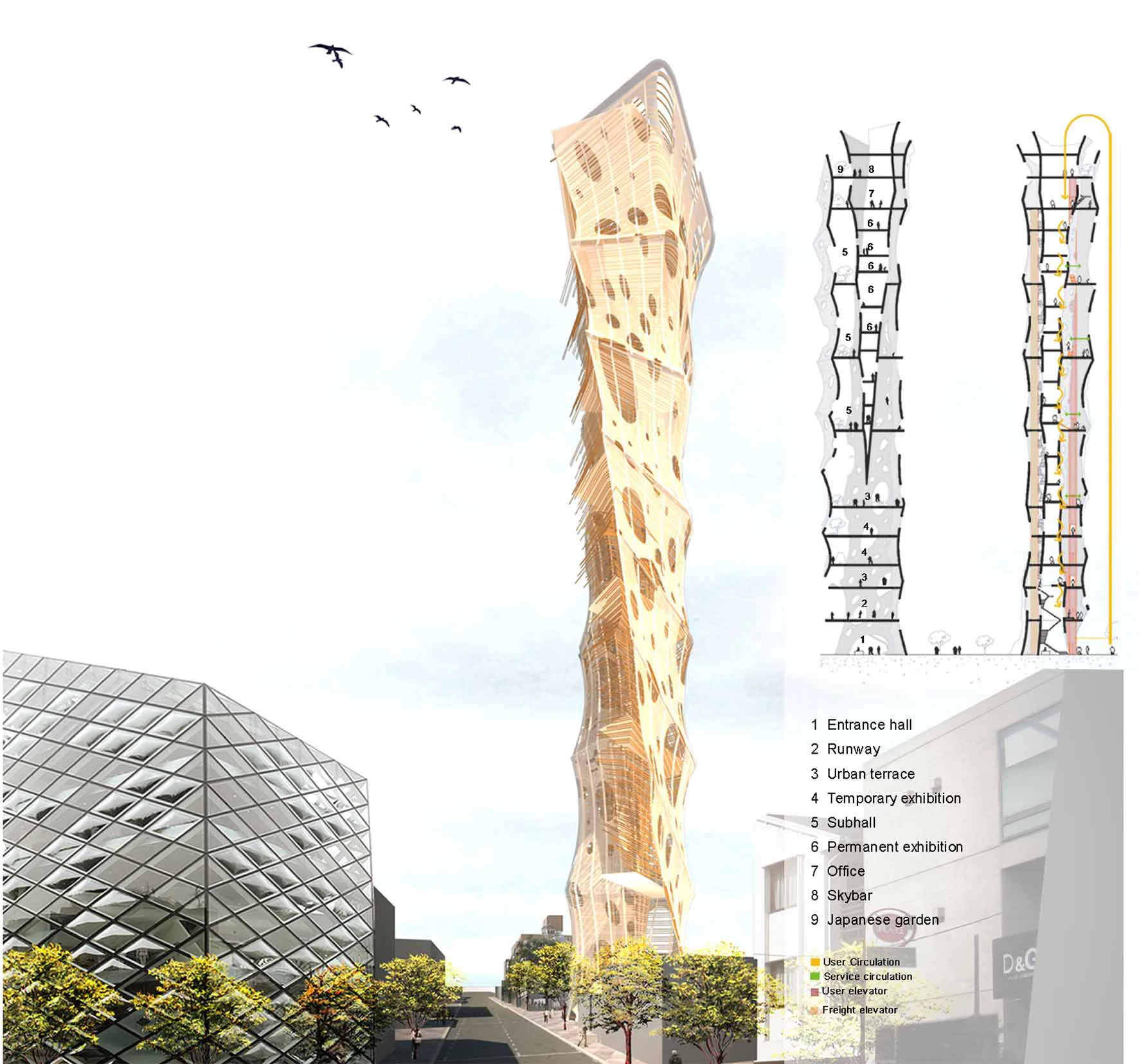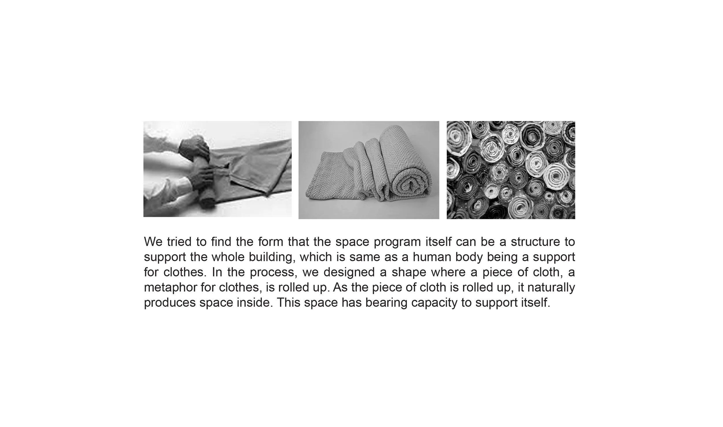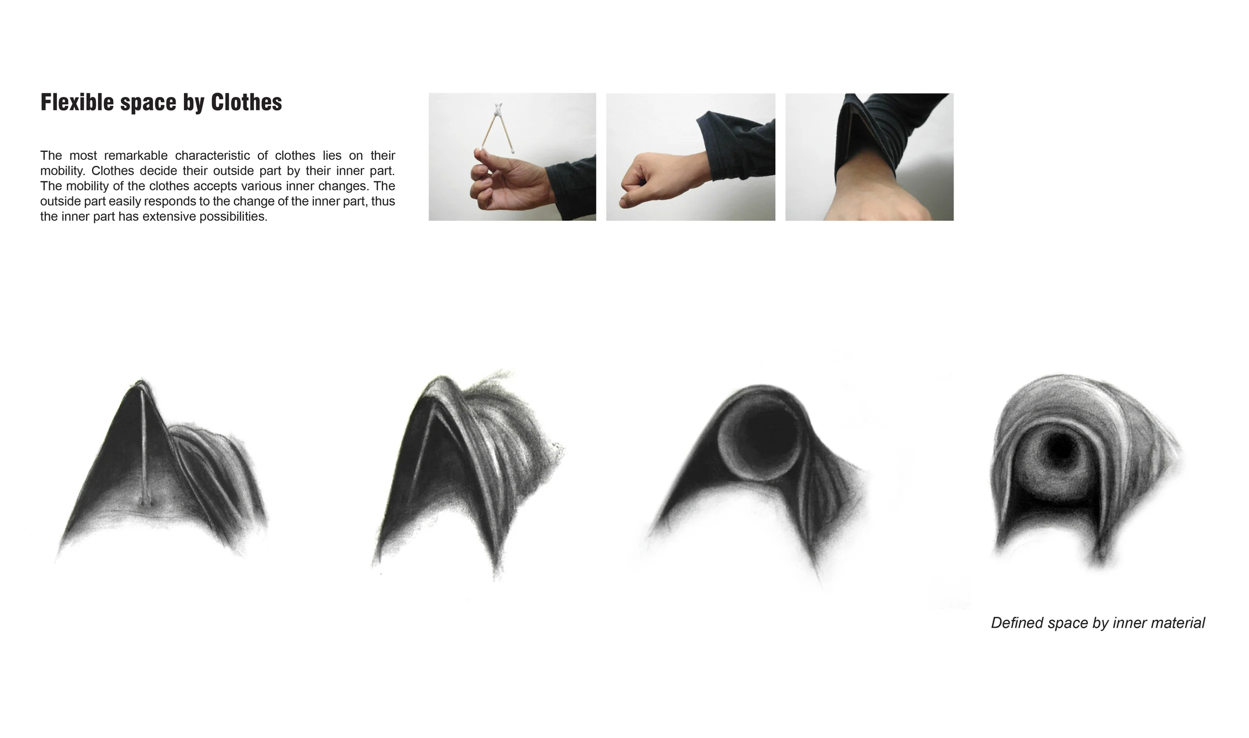 Clothes as space can be investigated from various viewpoints through the change of scale. If we enlarge the conception of clothes, clothes become a house. When we expand the scope more widely, clothes may become a hypermarket or a big city. This project starts from the change of the perspective on architecture through clothes and aims to convert original characteristics of clothes to architectural space.