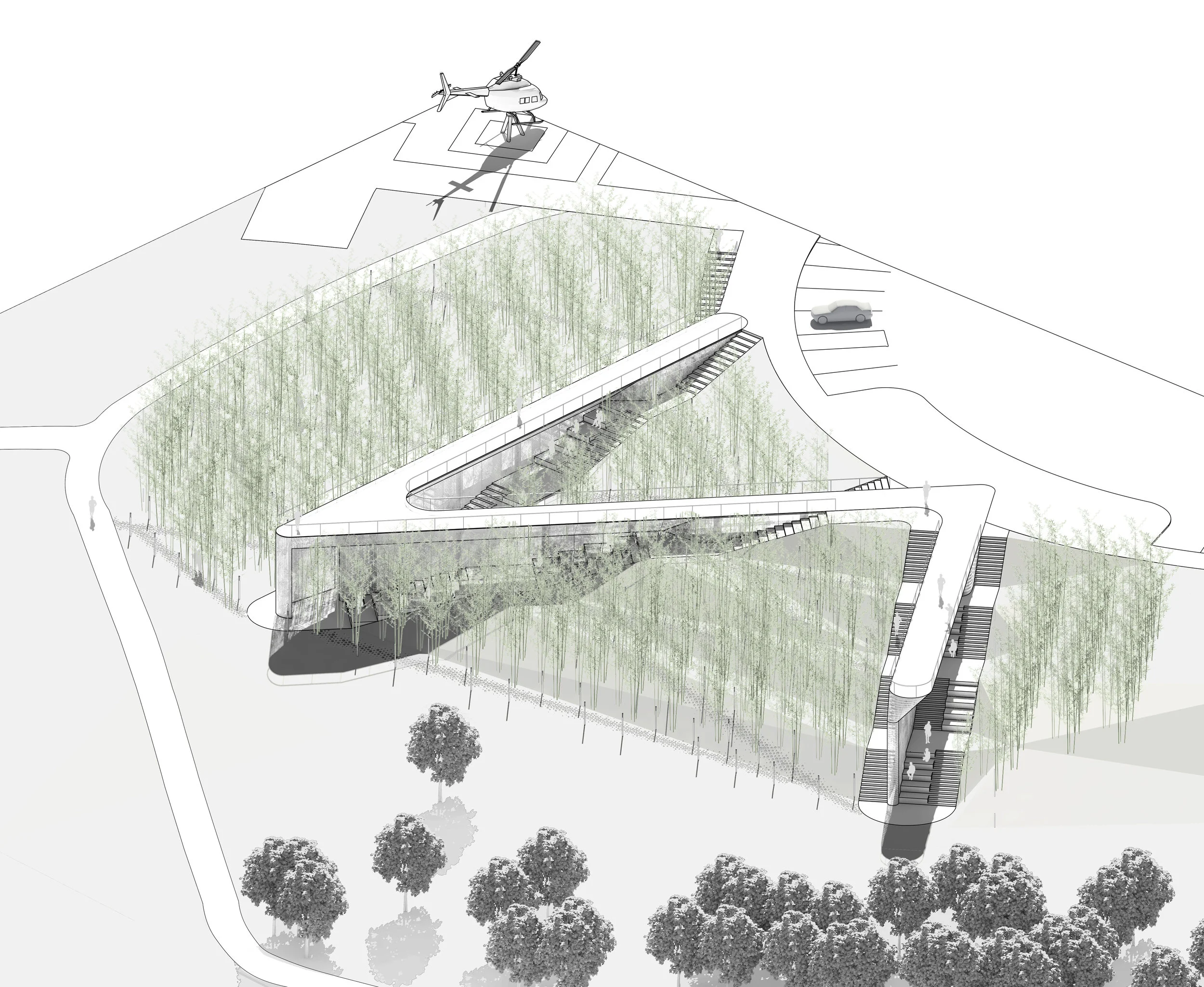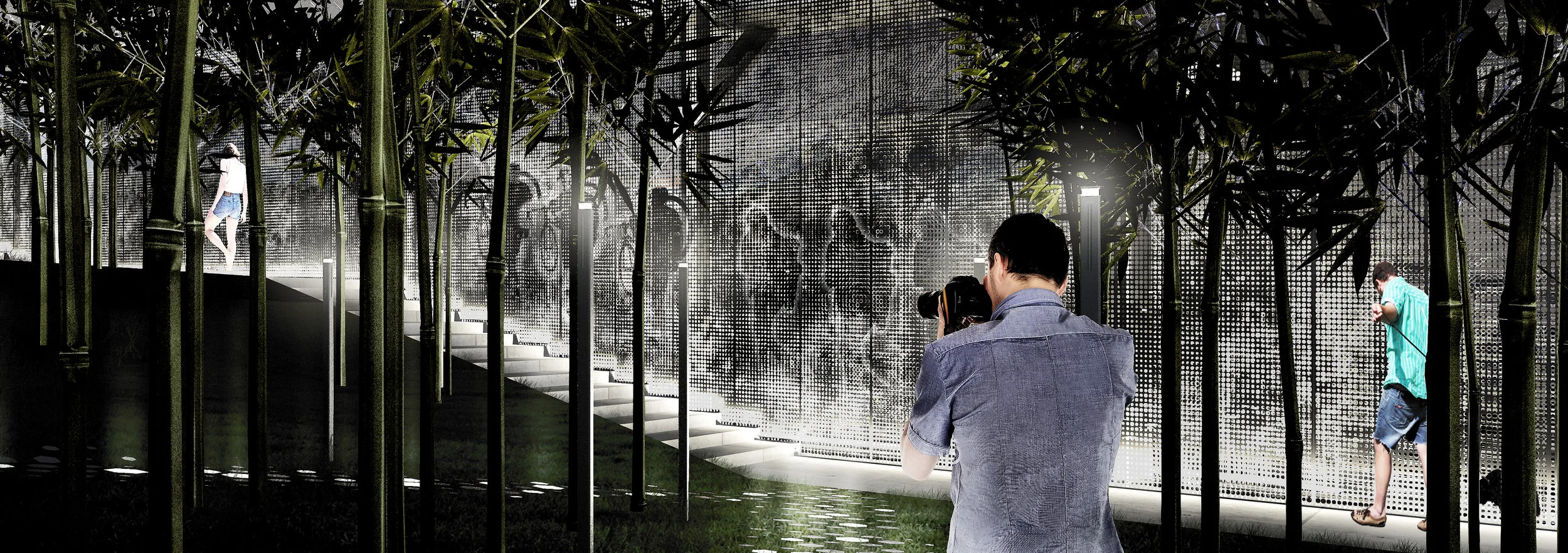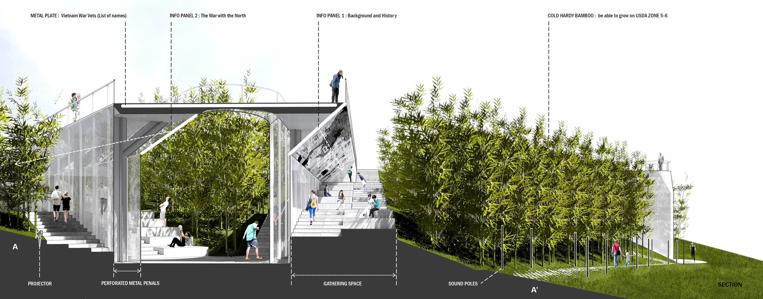 The journey of mourning begins in the bamboo forest. A bamboo forest, not common in Louisville, isolates the site from the rest of the park. Sounds of wind blowing and footsteps from "sound poles," silhouettes of people passing through the "perforated metal screen," and the "bamboo trees" create a landscape of memory. The proposal creates an atmosphere of unfamiliar nature for the visitors, evoking the experience of the veterans in the beginnings of Vietnam.The visitor becomes a participant and an observer at the simultaneously. Walking through the shaded path of the bamboo forest, viewers are placed momentarily in Vietnam's deep forests. They recall the anxiety and uncertainty that the veterans would have experienced walking amongst the shadows and silhouettes. Engraved on the upper portion of the metal screen is a written history of the Vietnam war and the events that have taken place since then. The top of the structure is designated as an observatory for visitors to view the bamboo forest from atop, where one comes to the sky to tribute and remember those in the light. The proposed projects is a capture of a moment in history that is also a sacred space of mourning and reverence.