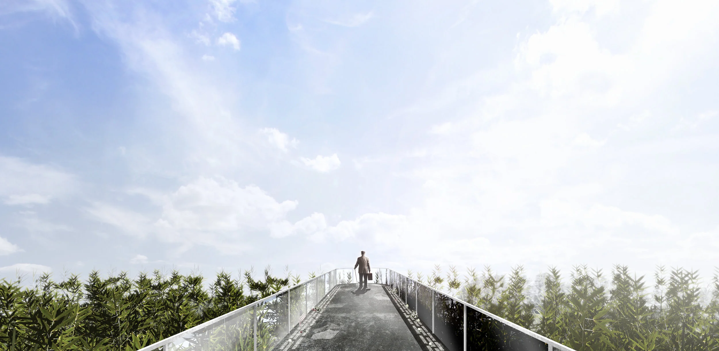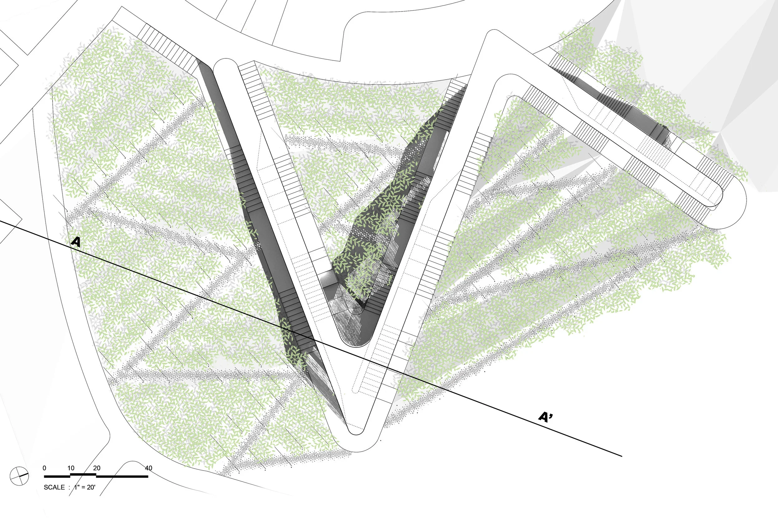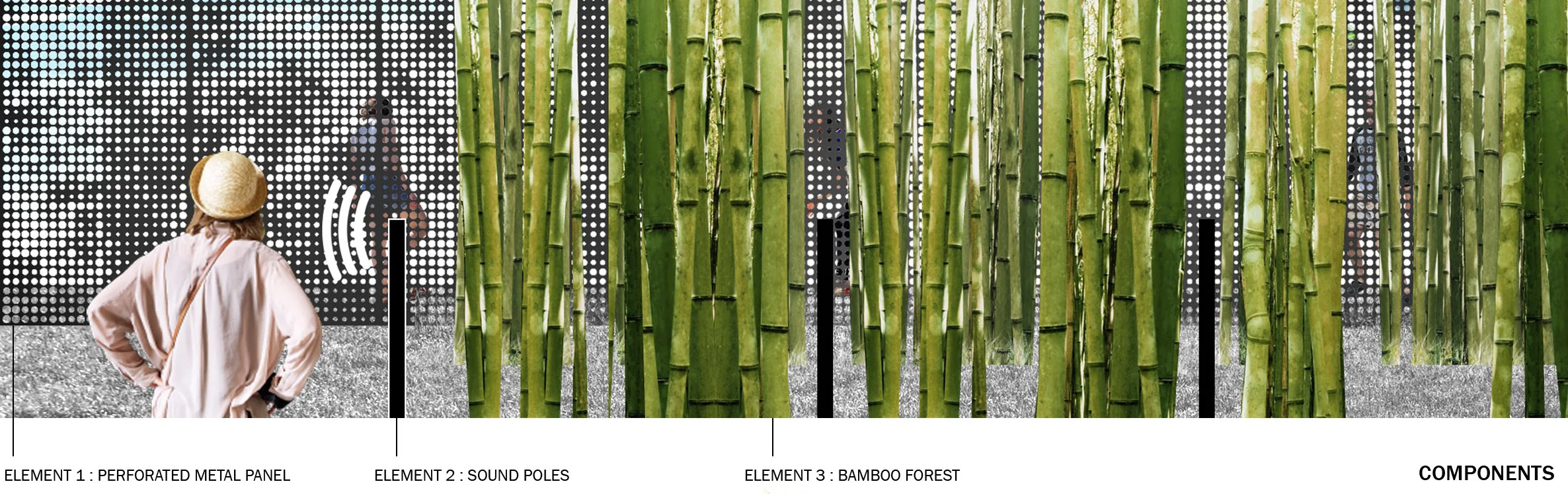 The journey of mourning begins in the bamboo forest. A bamboo forest, not common in Louisville, isolates the site from the rest of the park. Sounds of wind blowing and footsteps from "sound poles," silhouettes of people passing through the "perforated metal screen," and the "bamboo trees" create a landscape of memory. The proposal creates an atmosphere of unfamiliar nature for the visitors, evoking the experience of the veterans in the beginnings of Vietnam.The visitor becomes a participant and an observer at the simultaneously. Walking through the shaded path of the bamboo forest, viewers are placed momentarily in Vietnam's deep forests. They recall the anxiety and uncertainty that the veterans would have experienced walking amongst the shadows and silhouettes. Engraved on the upper portion of the metal screen is a written history of the Vietnam war and the events that have taken place since then. The top of the structure is designated as an observatory for visitors to view the bamboo forest from atop, where one comes to the sky to tribute and remember those in the light. The proposed projects is a capture of a moment in history that is also a sacred space of mourning and reverence.