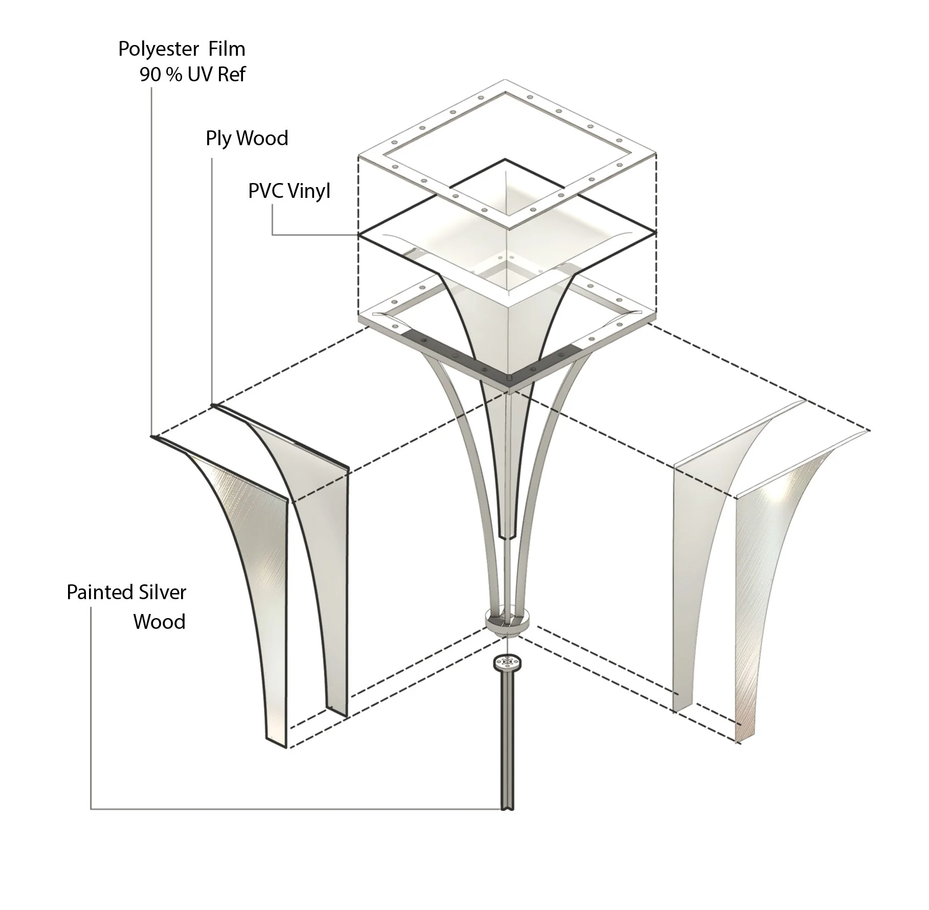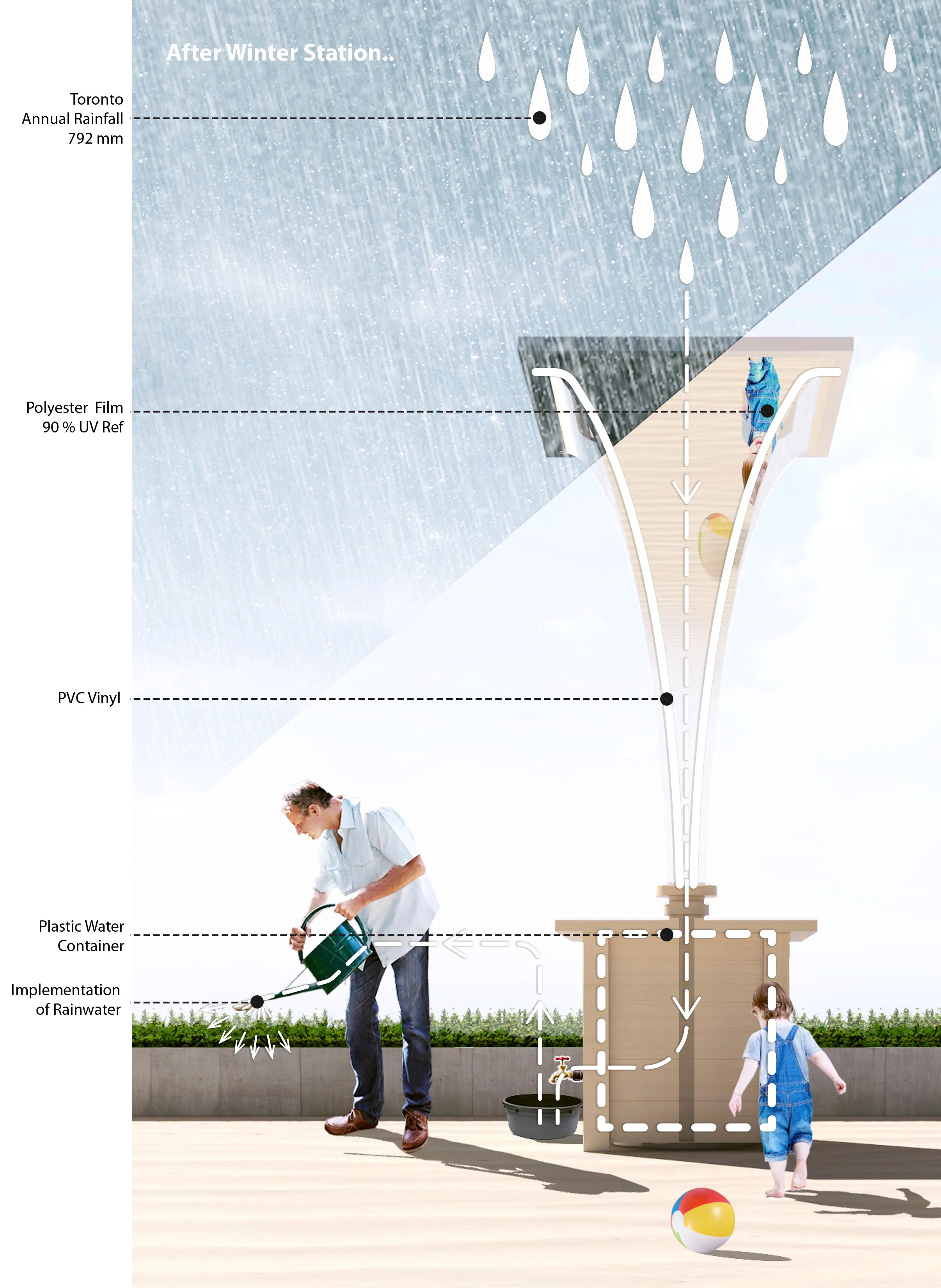 In urban environments, most rainwater is lost: Only 15 percent of storm water reenters the ground on developed landscapes (as opposed to 50 percent on natural landscapes). With a global shortage of water supply, rainwater conservation has been a critical issue for a long time. The proposal is intended to be reused as rainwater catcher after the installation and remind the crisis, which we are facing and easily be forgotten.