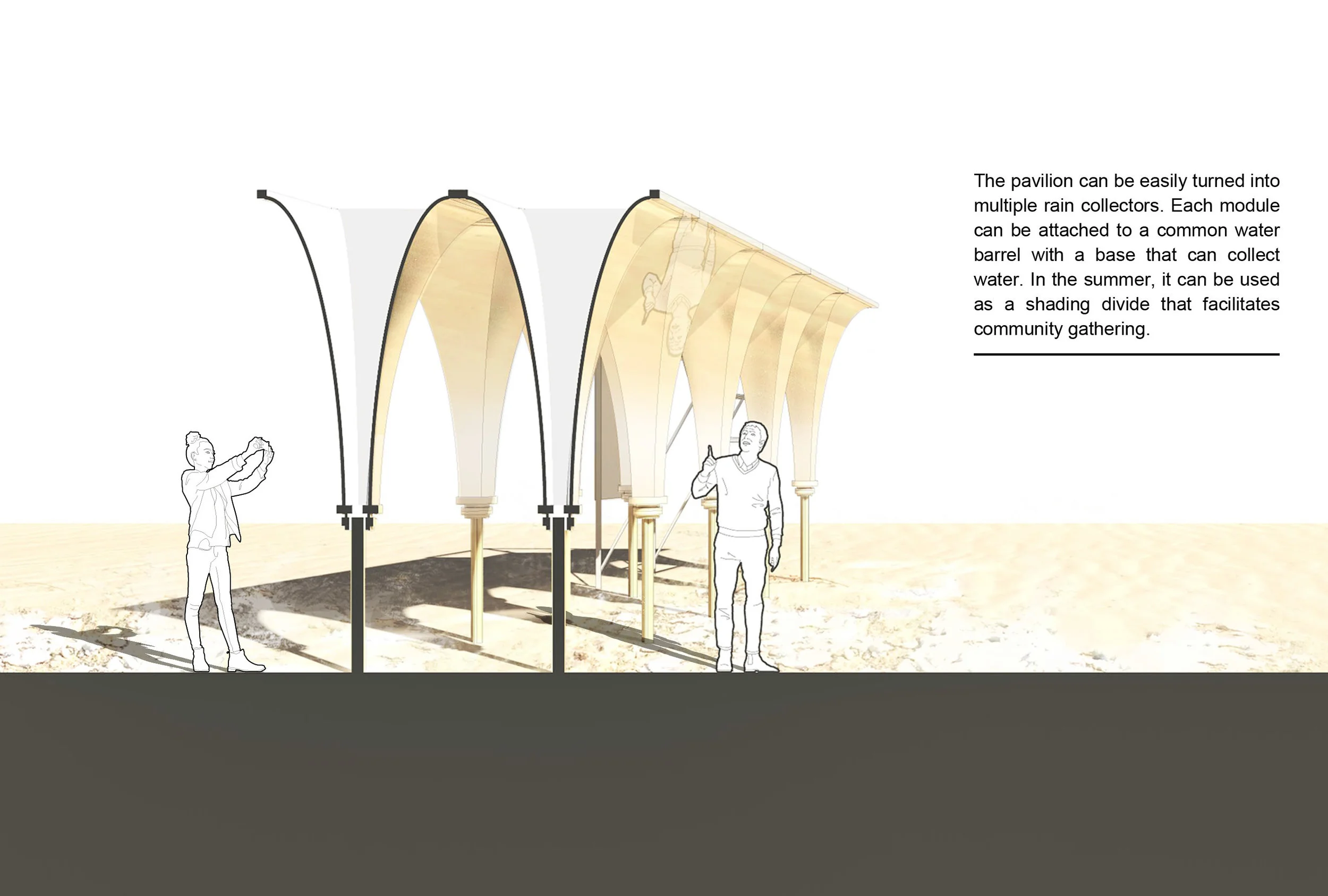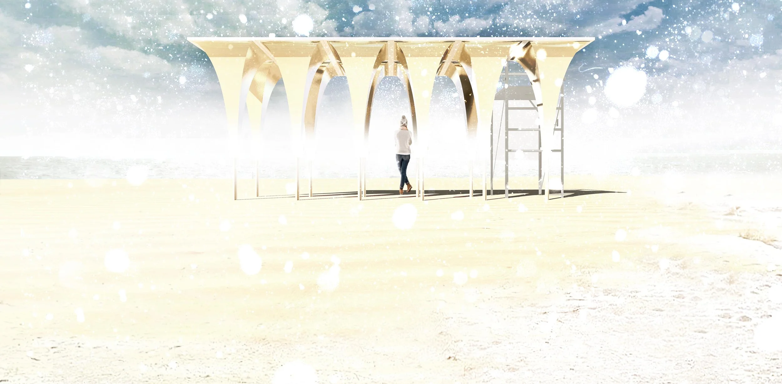 The Sandcastle reshape and enriches Toronto’s waterfront through curved high reflective panels. Attached Polyester Film allows the structure to mirror surrounded nature and curved surface creates reversed scenery of Toronto beach. By reflecting and reversing surrounding, the proposal gives surrealistic experience to visitors - hovering sand castle. Sky holds up the sand beach and visitors pass under the reflection of sand beach. It may remind them their childhood playing with a sand castle on the beach.